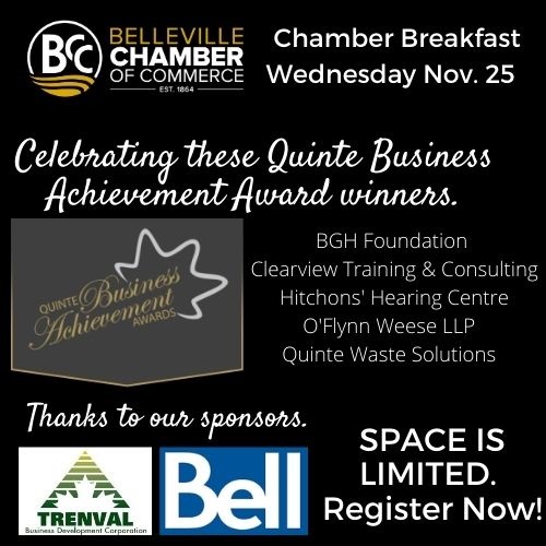 We recently celebrated the Quinte Business Achievement Awards and a few of our members carried home some pretty hefty hardware. Join us for the first Chamber breakfast since February, and celebrate the achievements and hear the stories from these award winners.