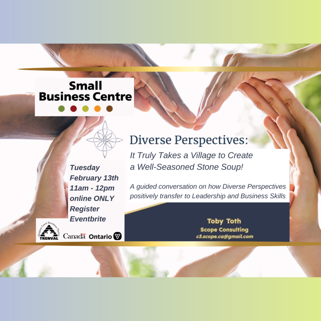 Join Toby Toth CD, Founder and Senior Consultant of Scope Consulting for a guided conversation and contemplation on Diverse Perspectives: It Truly Takes a Village to Create a Well-Seasoned Stone Soup!
