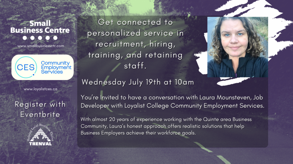 You’re invited to have a conversation with Laura Mounsteven, Job Developer with Loyalist College Community Employment Services. With almost 20 years of experience working with the Quinte area Business Community, Laura’s honest approach offers realistic solutions to help small business employers achieve their workforce goals. Get connected to personalized service in recruitment, hiring, training, and retaining staff.