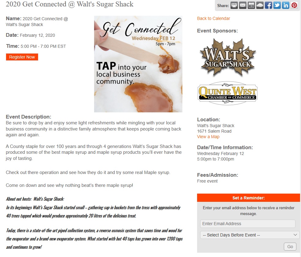 Quinte West Chamber of Commerce: Get Connect @ Walt’s Sugar Shack Posted on February 6, 2020February 6, 2020 by cedit REGISTER