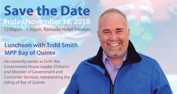 Quinte West Chamber of Commerce: Lunheon with Todd Smith, MPP Bay of Quinte Posted on October 19, 2018October 19, 2018 by cedit Cost is $30 – more info to come.
