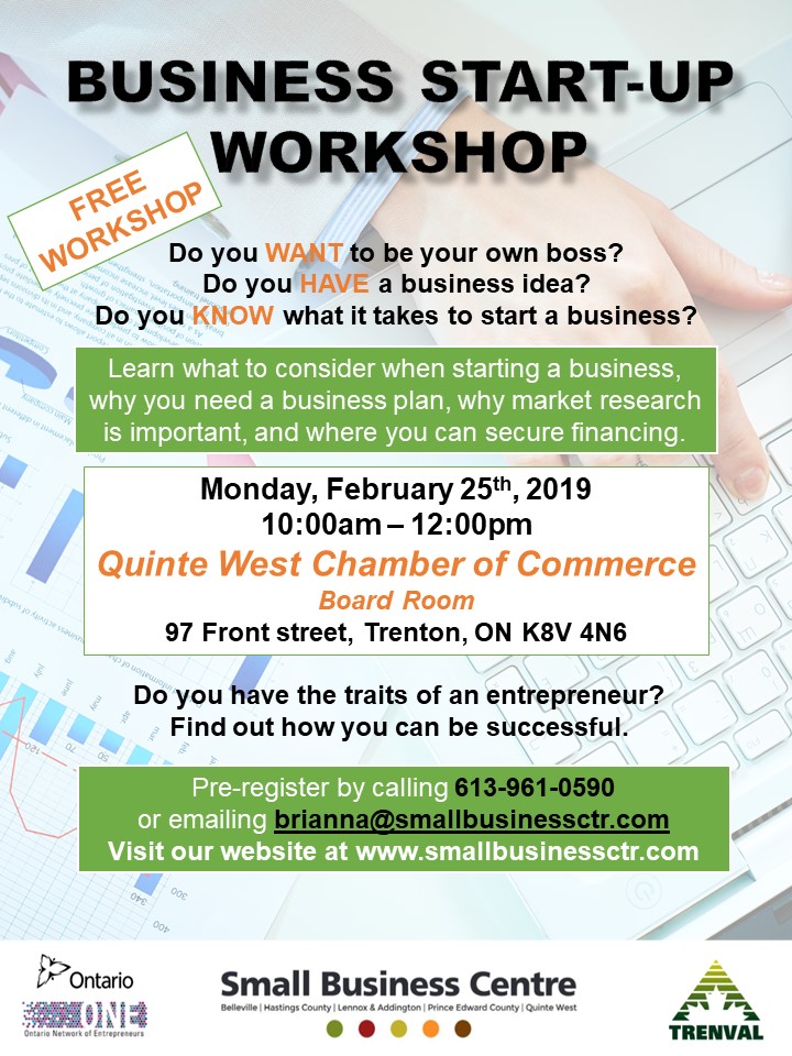 Small Business Centre: Business Start-Up Workshop: City of Quinte West (Trenton) Posted on November 9, 2018 by cedit