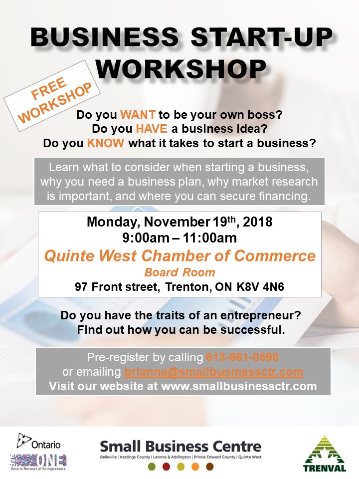 Small Business Centre: Business Start-Up Workshop – City of Quinte West (Trenton) Posted on November 9, 2018 by cedit