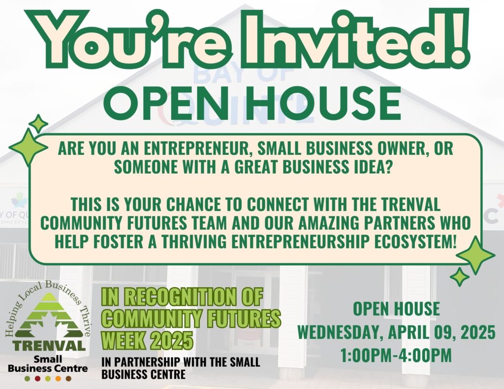 In recognition of Community Futures Week 2025, Trenval will be hosting an Open House for all clients, community members and partners at the Bay of Quinte Business Centre. Come on out and meet our incredible team!