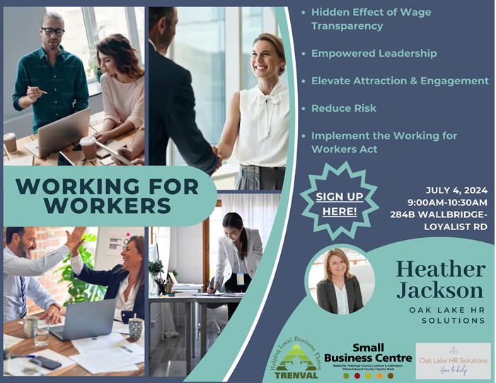 Join us in person at the Small Business Centre on Thursday, July 4 for our ‘Working for Workers” Workshop, all about the hidden effects of wage transparency, elevating attraction & engagement, implementing the Working for Workers Act, and MUCH more!